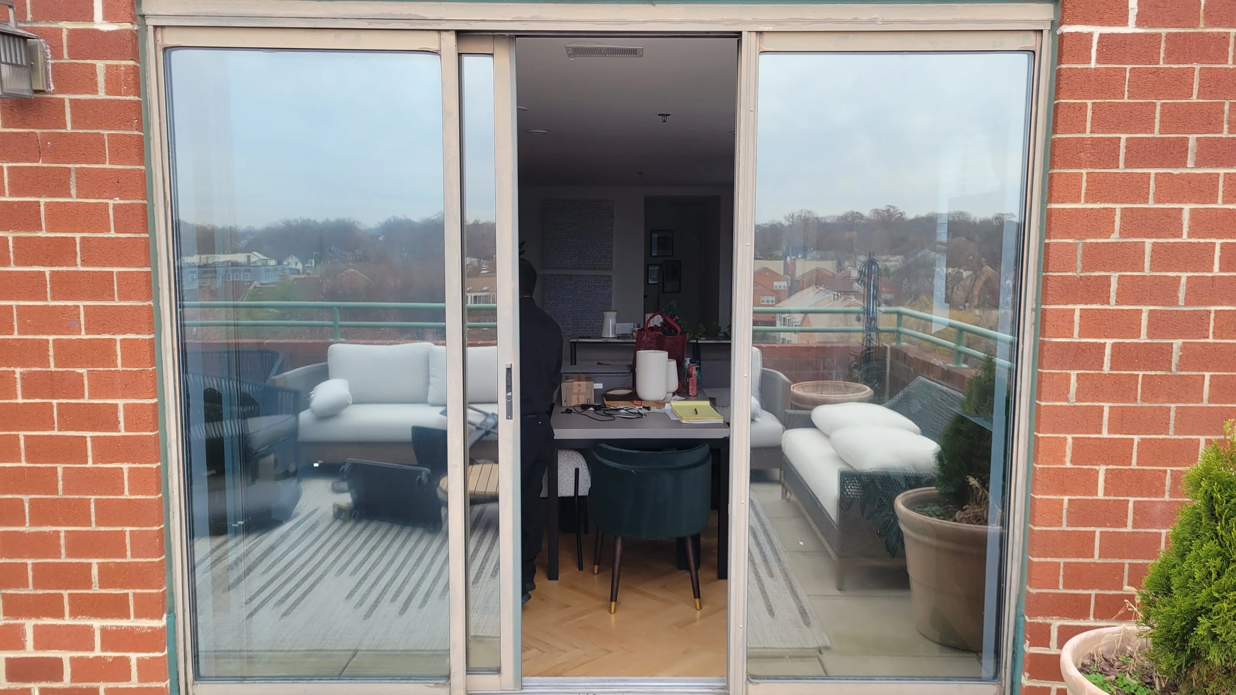Solution: Precision installation of three-piece sliding glass door system with comprehensive masonry repair and flashing details at patio base