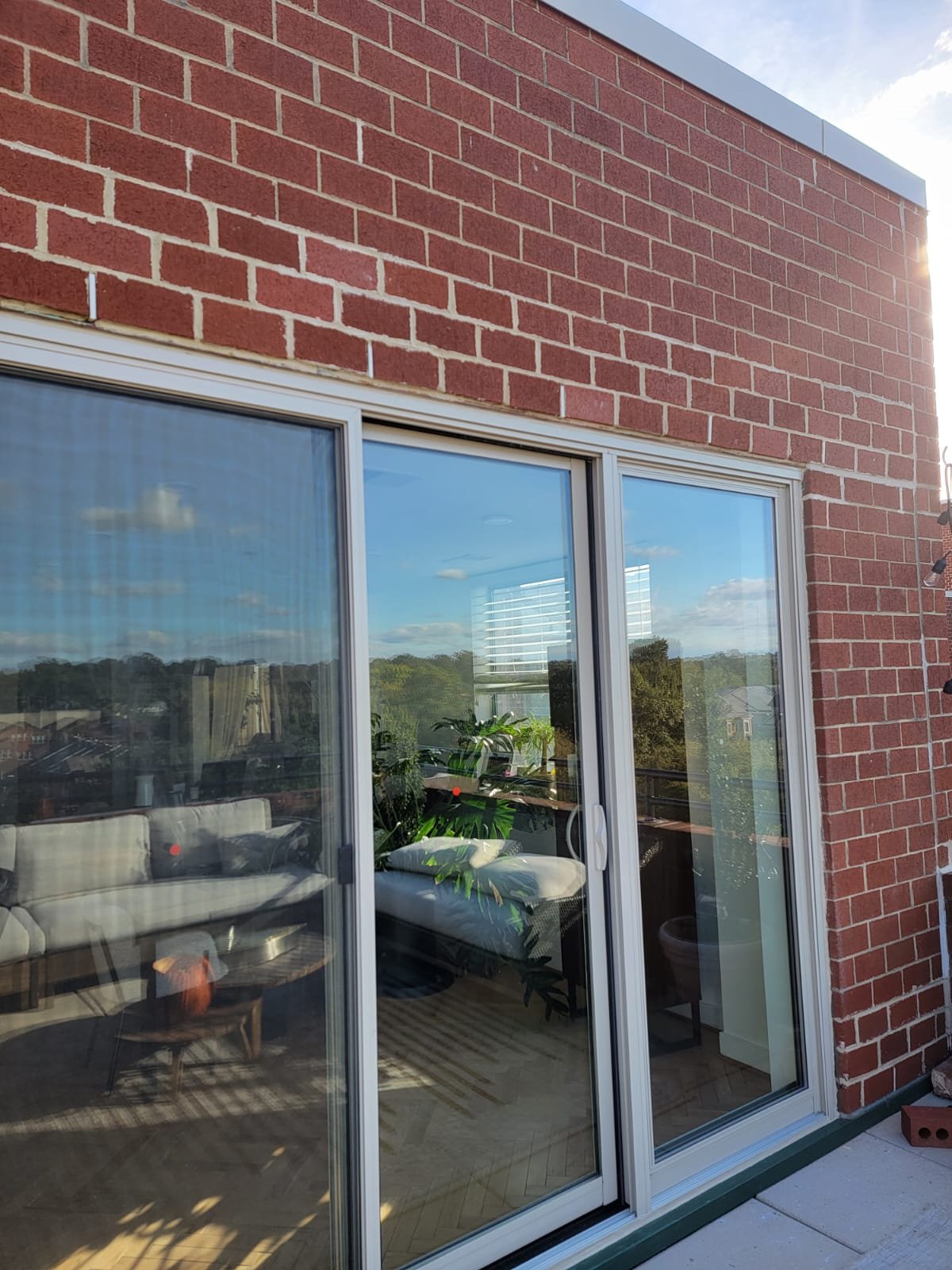 Precision installation of three-piece sliding glass door system with comprehensive masonry repair and flashing integration for long-term weathertight performance.
